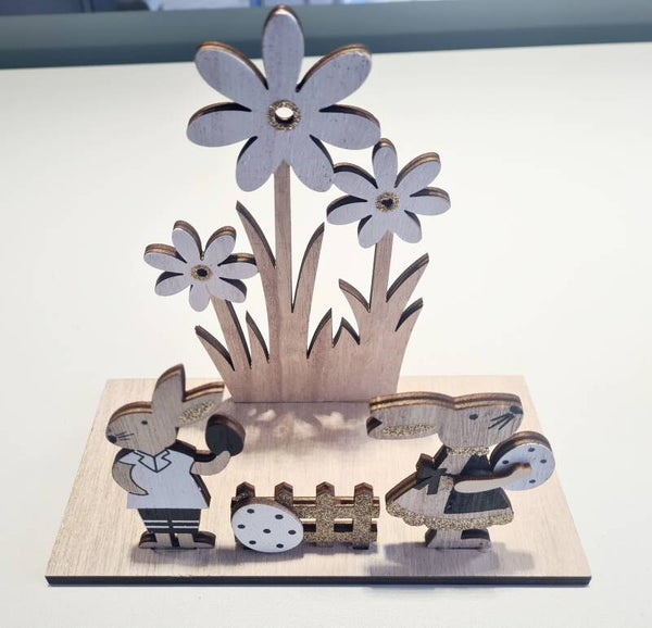 Decoratief houten paastafereeltje, met 500gr pralines/gevulde paaseitjes